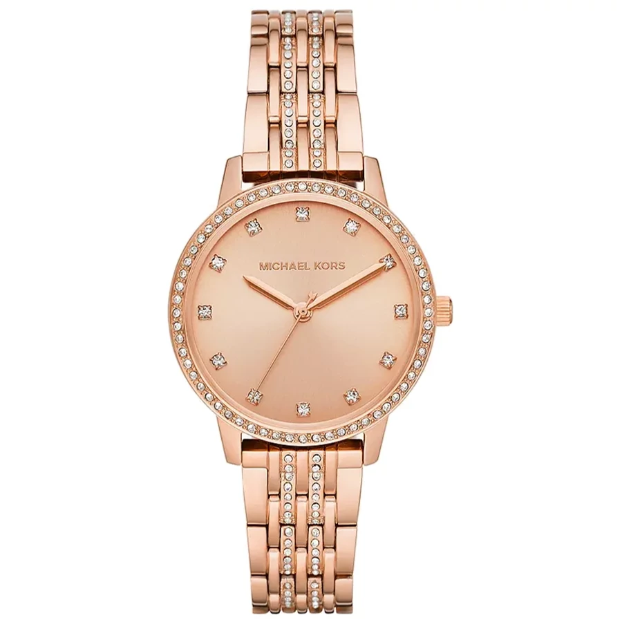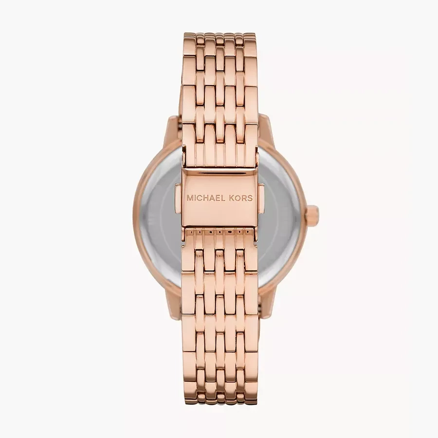 A MICHAEL KORS MELISSA MK4369 karóra 5 BAR nyomásig alapszinten vízálló, rozé ( rózsa arany ) színű nemesacél tokkal, edzett kristályüveggel, rozé ( rózsa arany ) színű tömör szemekből álló acélcsattal, nyitáskönnyített csatközéppel készül. Az órát pontos quartz óraszerkezet működteti, mely elemmel működik.