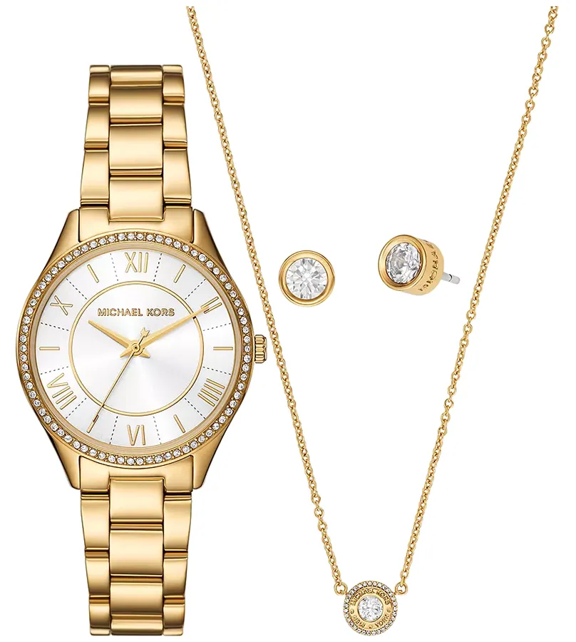 A MICHAEL KORS LAURYN MK4849SET karóra 5 BAR nyomásig alapszinten vízálló, aranyszínű nemesacél tokkal, edzett kristályüveggel, aranyszínű tömör szemekből álló acélcsattal, nyitáskönnyített csatközéppel készül. Az órát pontos quartz óraszerkezet működteti, mely elemmel működik.