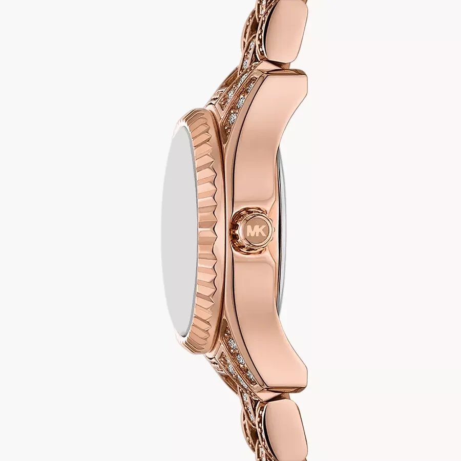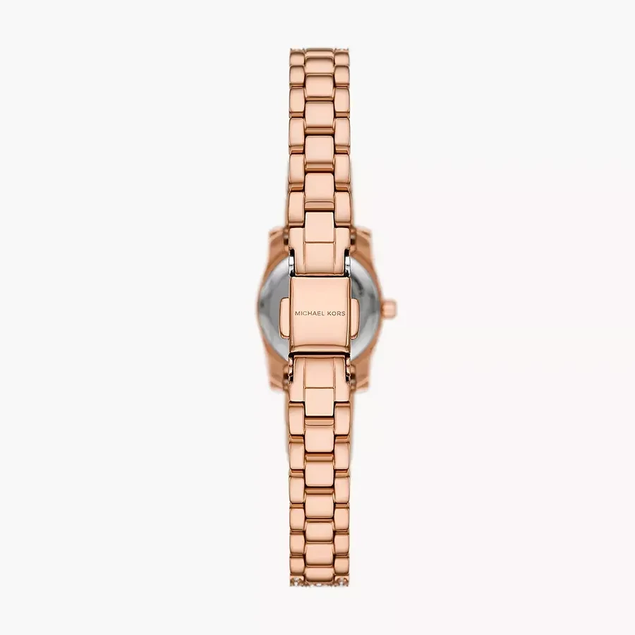 A MICHAEL KORS MINI LEXINGTON MK4863 karóra 5 BAR nyomásig alapszinten vízálló, rozé ( rózsa arany ) színű nemesacél tokkal, edzett kristályüveggel, rozé ( rózsa arany ) színű tömör szemekből álló acélcsattal, nyitáskönnyített csatközéppel készül. Az órát pontos quartz óraszerkezet működteti, mely elemmel működik.
