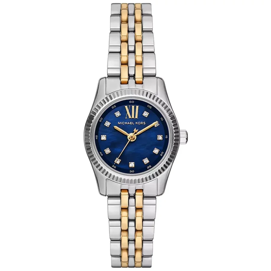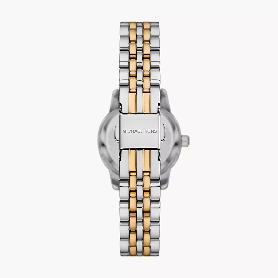 A MICHAEL KORS WOMAN'S LEXINGTON MK4865 karóra 5 BAR nyomásig alapszinten vízálló, ezüstszínű nemesacél tokkal, edzett kristályüveggel, bicolor ( többszínű ) tömör szemekből álló acélcsattal, nyitáskönnyített csatközéppel készül. Az órát pontos quartz óraszerkezet működteti, mely elemmel működik.