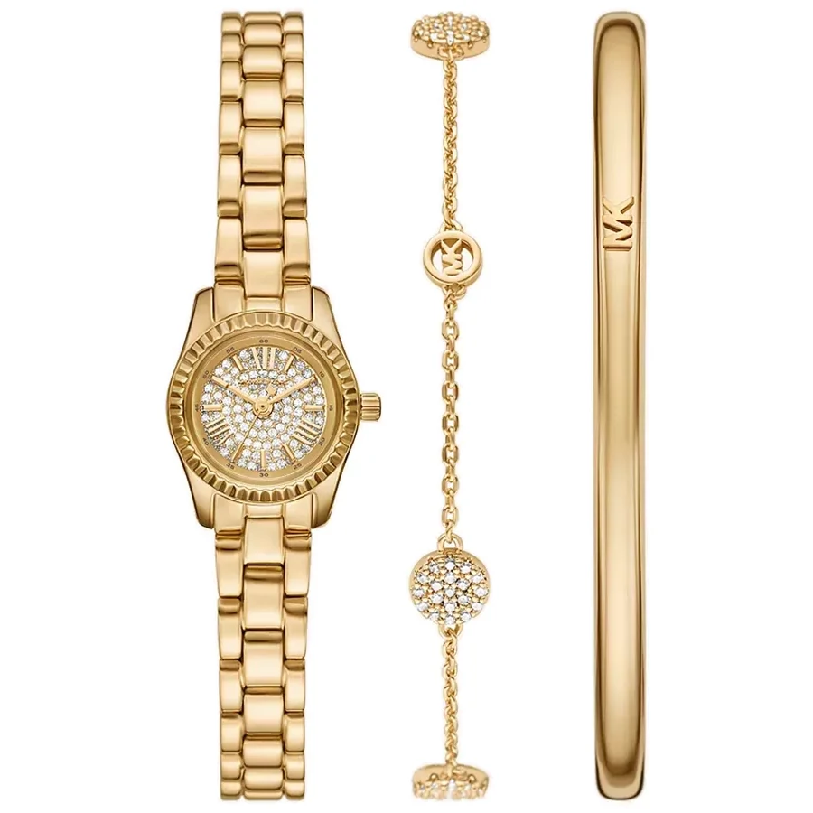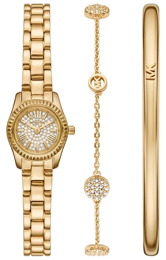 A MICHAEL KORS MINI LEXINGTON MK4944SET karóra 5 BAR nyomásig alapszinten vízálló, aranyszínű nemesacél tokkal, edzett kristályüveggel, aranyszínű tömör szemekből álló acélcsattal, nyitáskönnyített csatközéppel készül. Az órát pontos quartz óraszerkezet működteti, mely elemmel működik.