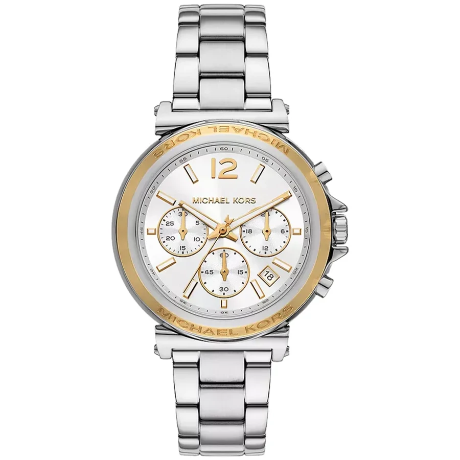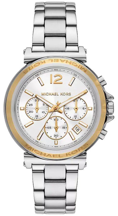 A MICHAEL KORS MAREN MK7495 karóra 5 BAR nyomásig alapszinten vízálló, bicolor ( többszínű ) nemesacél tokkal, edzett kristályüveggel, ezüstszínű tömör szemekből álló acélcsattal, nyitáskönnyített csatközéppel készül. Az órát pontos quartz óraszerkezet működteti, mely elemmel működik. Az óráról a pontos idő mellett leolvasható a nap is. 1/1 másodperces mérési egységű stoppert használhat maximum 30 perc mérési idővel.