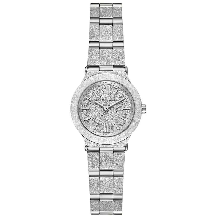 A MICHAEL KORS BILLIE MK7555 karóra 5 BAR nyomásig alapszinten vízálló, ezüstszínű nemesacél tokkal, edzett kristályüveggel, ezüstszínű tömör szemekből álló acélcsattal, nyitáskönnyített csatközéppel készül. Az órát pontos quartz óraszerkezet működteti, mely elemmel működik.