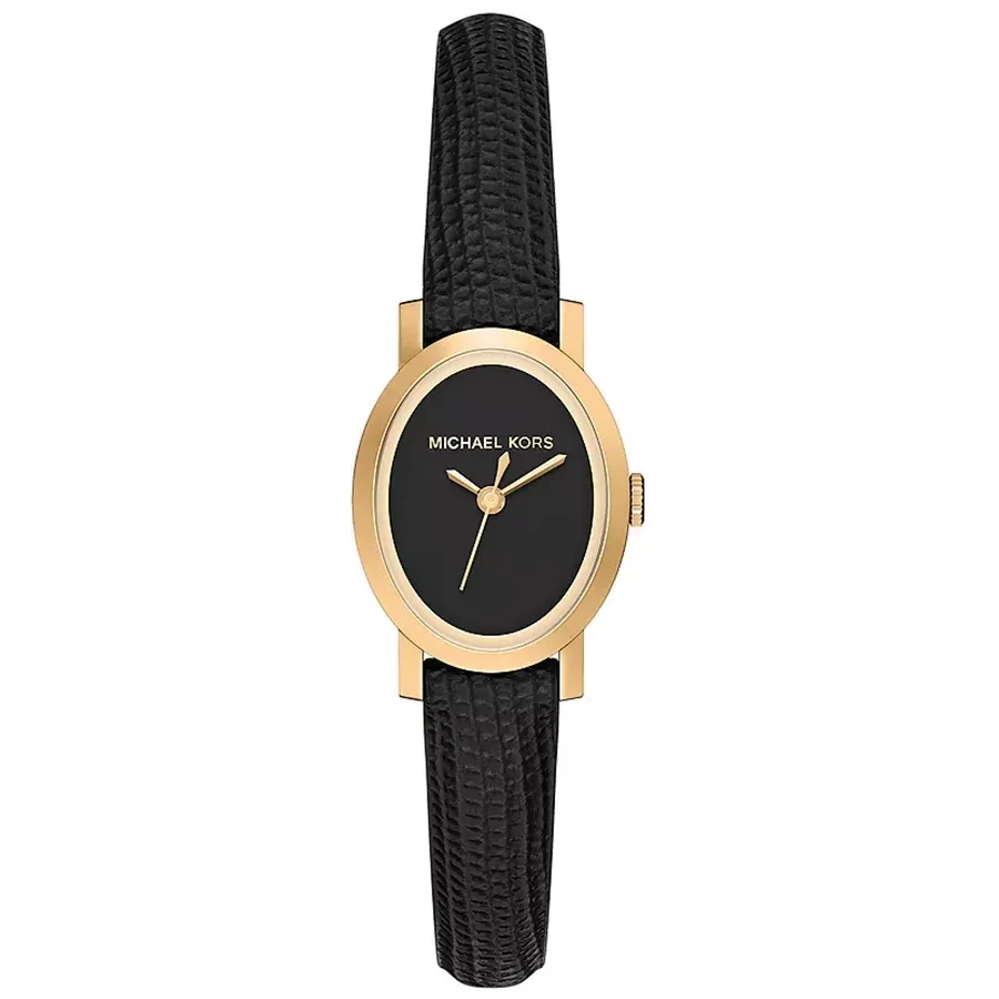 A MICHAEL KORS MAUDE MK7585 karóra cseppálló, aranyszínű nemesacél tokkal, edzett kristályüveggel, fekete színű valódi bőrszíjjal készül. Az órát pontos quartz óraszerkezet működteti, mely elemmel működik.