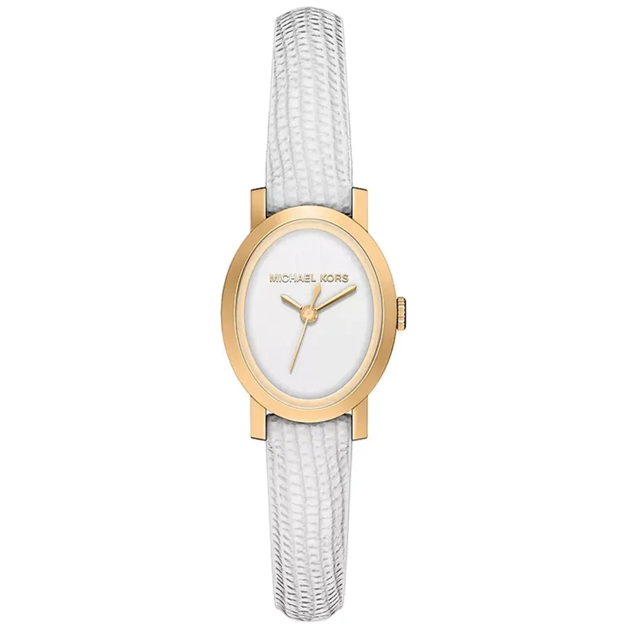 A MICHAEL KORS MAUDE MK7586 karóra cseppálló, aranyszínű nemesacél tokkal, edzett kristályüveggel, fehér színű valódi bőrszíjjal készül. Az órát pontos quartz óraszerkezet működteti, mely elemmel működik.
