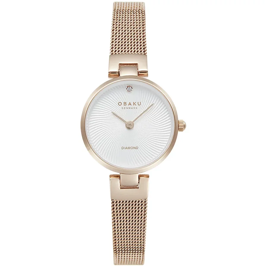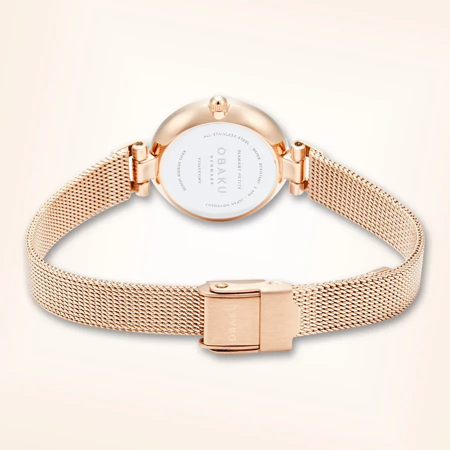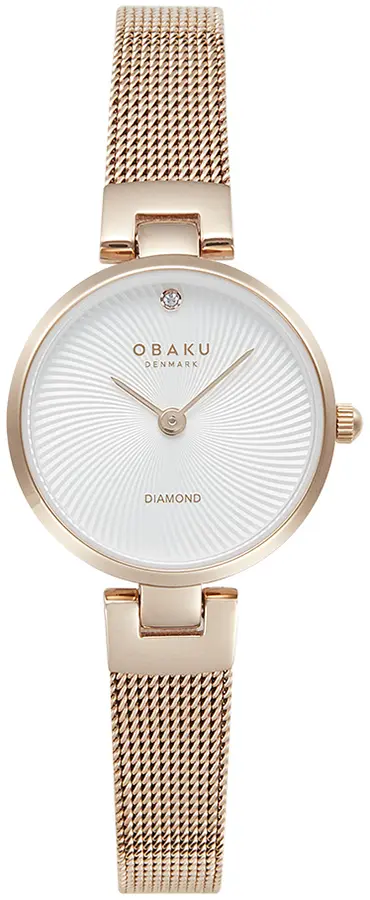 AZ OBAKU V256 DIAMANT PETITE V256SXVIMV karóra cseppálló, rozé ( rózsa arany ) színű nemesacél tokkal, edzett kristályüveggel, rozé ( rózsa arany ) színű acélcsattal, csúszkás csatközéppel készül. Az órát pontos quartz óraszerkezet működteti, mely elemmel működik (kb. 3 év az elem várható élettartama). Az órát valódi gyémánt díszíti.